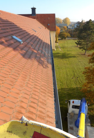 Solche Reparaturen sind ohne teure Rüstung mittels eigener Hebebühne kurzfristig durchführbar. Die schnelle Umsetzung von Kleinreparaturen gehört zur besonderen Stärke von MIWA Dachbau.