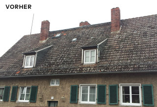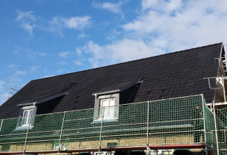 Hierbei handelt es sich um die Sanierung eines Mehrfamilienhauses durch eine kostengünstige und wirkungsvolle Dacheindeckung mit schwarzen Betondachsteinen.