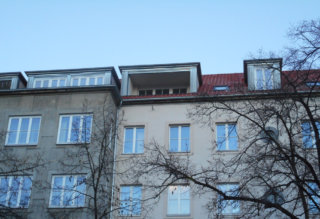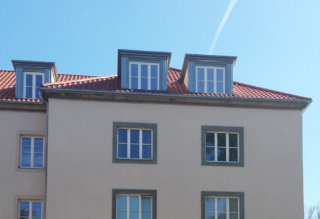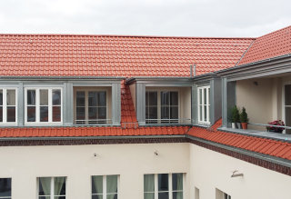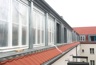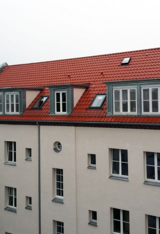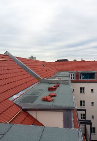Während der Dachsanierung der Häuserreihe in Berlin waren die Wohnungen durchgehend bewohnt. Zur Ausführungen gehörten das Dach, die Wohnraumfenster, Gauben und Loggia. Die Dachsanierung im bewohnten Bereich wurde mit einem Großfalzziegel ausgeführt und die Gauben mit einer kombinierten Zinkstehfalzdeckung und Rockpanel verkleidet.