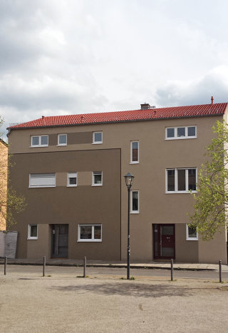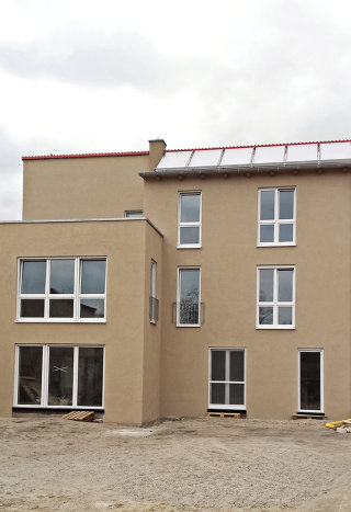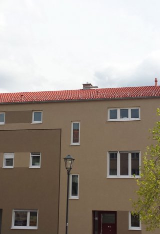 Die Dacheindeckung der Lückenbebauung in Brandenburg / Neustadt wurde mit einem Betondachstein ausgeführt. Das angrenzende Flachdach der Dachterrasse erhielt eine 2-lagige bituminöse Abdichtung auf einer darunterliegenden Gefälledämmung.